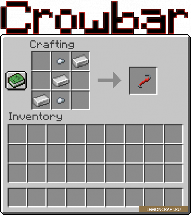 Мод на монтировку Crowbar tool небольшая модификация, добавляющая в игру красную монтировку. С помощью данного инструмента вы сможете взламывать железные двери, не используя для этого источники редстоун сигналов (кнопки, плиты и другое).